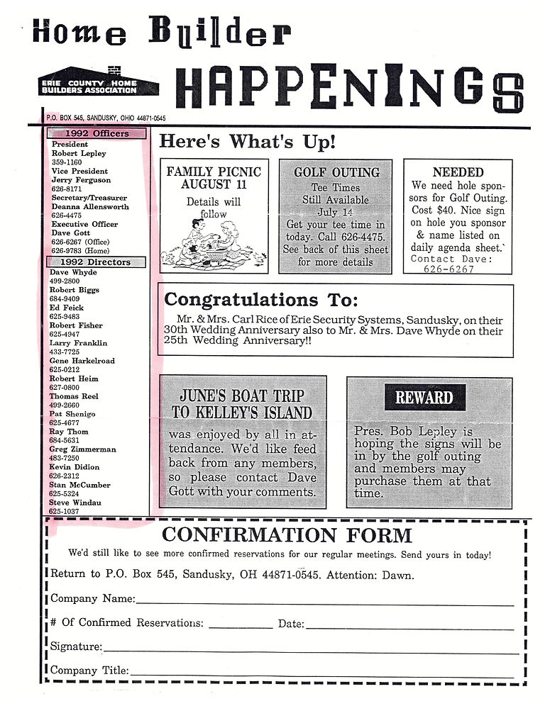 1992 Member Newsletter Body: The 1992 edition of Home Builder Happenings captured the association at an active and spirited moment in its history. Under President Robert Lepley, members gathered for a summer boat trip to Kelley's Island, looked ahead to a July Golf Outing, and planned a Family Picnic for August. The newsletter reflected a close-knit organization deeply invested in both its industry and its community.